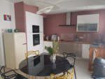 Espace cuisine séjour, il y a 1 cuisine équipée avec frigo, 1 micro-ondes, 1 four, 1 plaque de cuisson à induction, 1 lave vaisselle et tout le petit électro-ménager indispensable à de bonnes vacances. Il y a d’autre part une table ronde et quatre chaises stark.