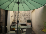 Dans le prolongement il y a une baie qui ouvre sur 1 terrasse avec table ronde, 4 chaises, 1 plancha, 1 desserte et 1 parasol.